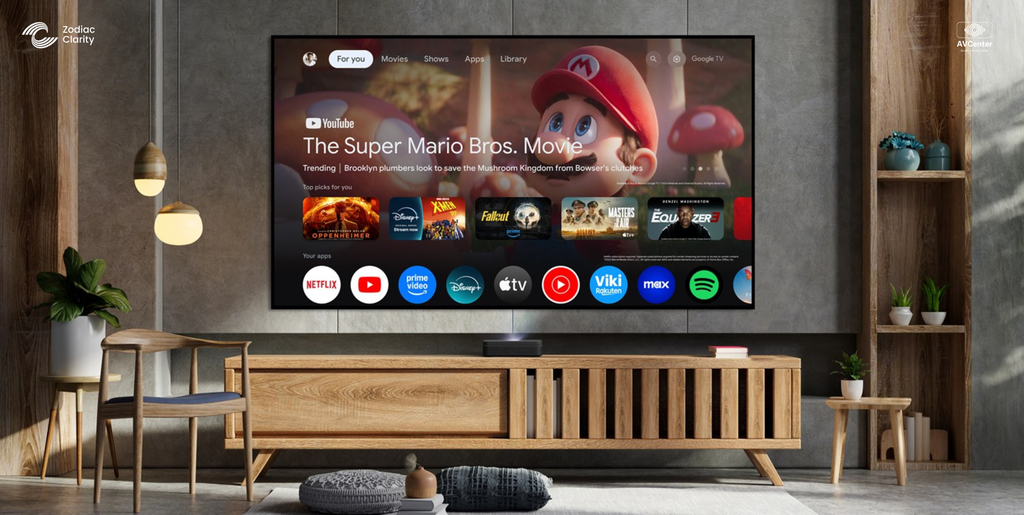 Máy hỗ trợ tự động lấy nét (auto focus) và tự động căn chỉnh khung hình (auto keystone), giúp người dùng không cần thao tác thủ công. Bên cạnh đó, hệ điều hành Google TV tích hợp cho phép truy cập trực tiếp YouTube, Netflix và các ứng dụng giải trí phổ biến.