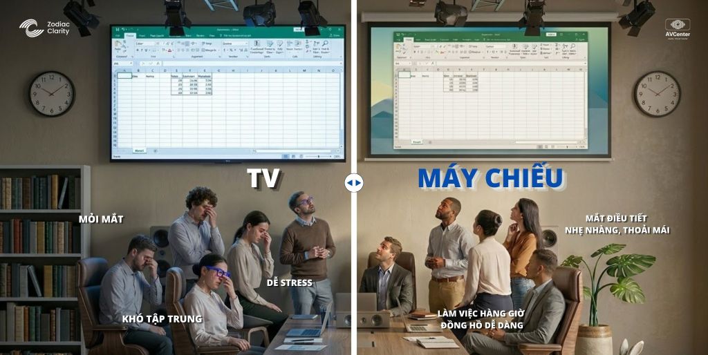 Mắt Mỏi Khi Làm Việc Trước Màn Hình Hàng Giờ: Máy Chiếu Hay TV Là Lựa Chọn Tốt Hơn Cho Doanh Nghiệp & Nhà Trường?