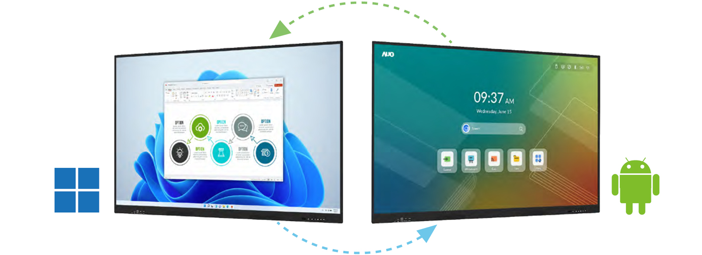 Màn hình AUO đáp ứng mọi ứng dụng từ doanh nghiệp với khả năng hội nghị video tích hợp đến một loạt công cụ tương tác đa dạng lý tưởng để thúc đẩy sự tương tác và hứng thú trong lớp học, phòng giảng, và mọi môi trường học tập.