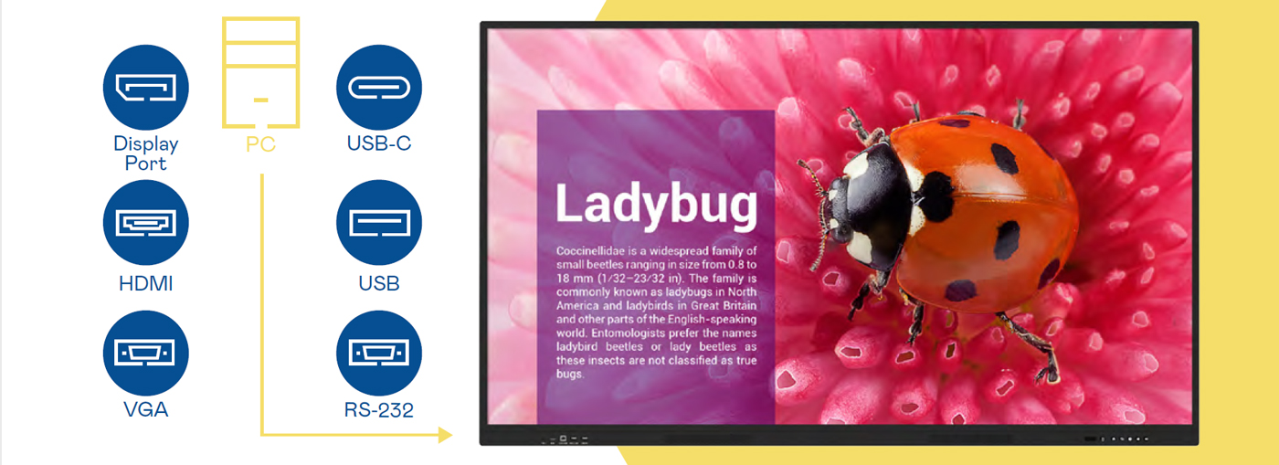 Màn hình tương tác AUO đặc biệt cung cấp nhiều khả năng mở rộng kết nối như USB, USB-C, DisplayPort, HDMI, VGA, RS-232 để bạn kết nối bất kỳ thiết bị nào. Hỗ trợ các kết nối USB-C, plug-n-play để truyền dữ liệu âm thanh, hình ảnh và nguồn thông qua một cáp duy nhất.