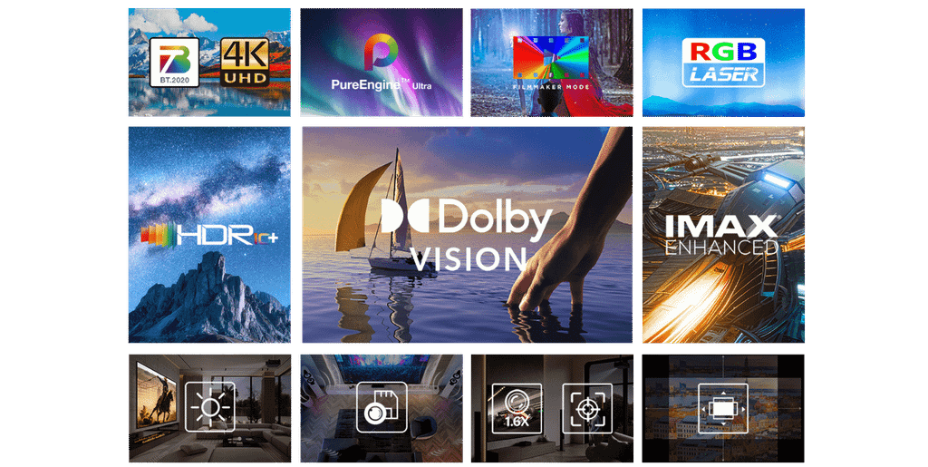 Nâng tầm không gian giải trí tại gia với máy chiếu 4K UHD, độ sáng 5.000 lumens, sử dụng nguồn sáng Triple-Laser RGB. Sản phẩm hỗ trợ Dolby Vision, IMAX Enhanced, Filmmaker Mode, HDR10+ và PureEngine™ Ultra, mang đến độ sáng vượt trội, độ tương phản sâu và màu sắc chân thực – tạo nên trải nghiệm điện ảnh đỉnh cao chưa từng có.